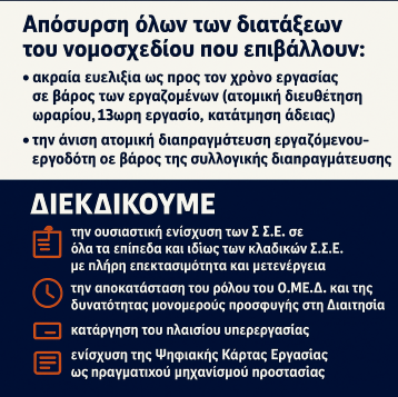- Απόσυρση όλων των διατάξεων που επιβάλλουν ακραία ευελιξία σε βάρος των εργαζομένων και υπονομεύουν τη συλλογική διαπραγμάτευση