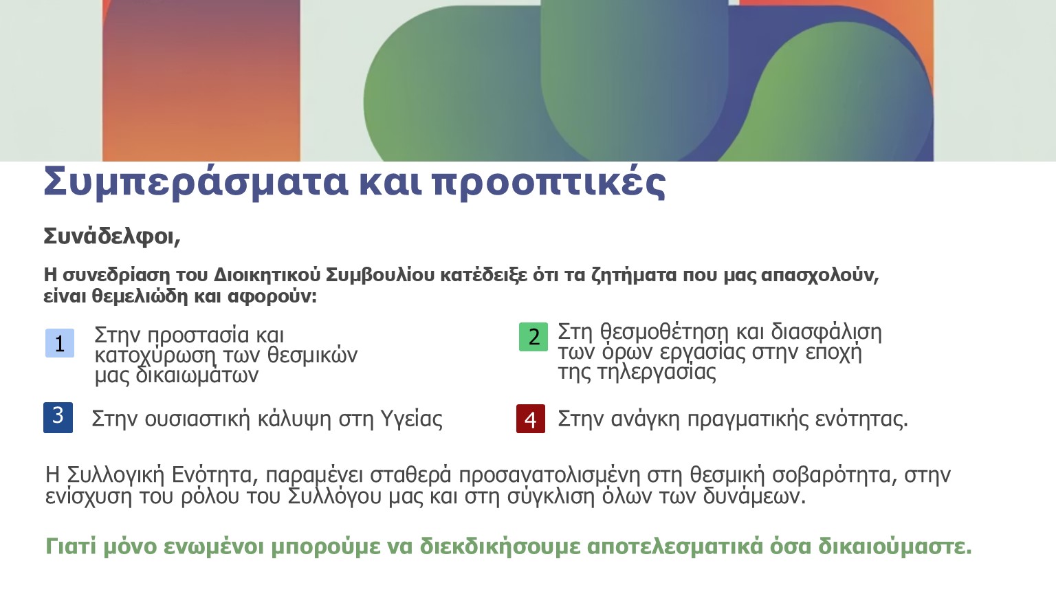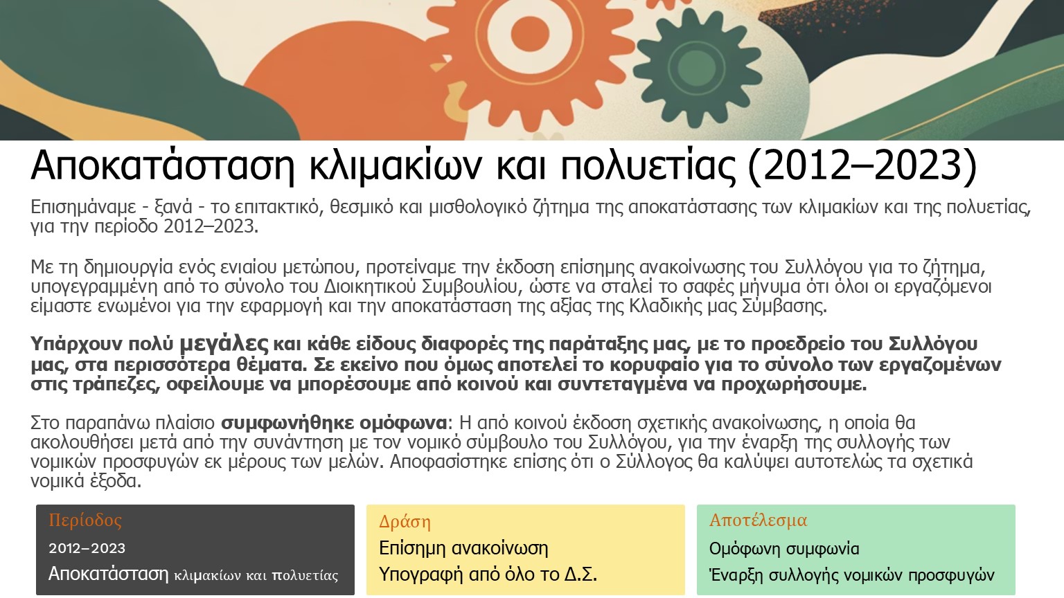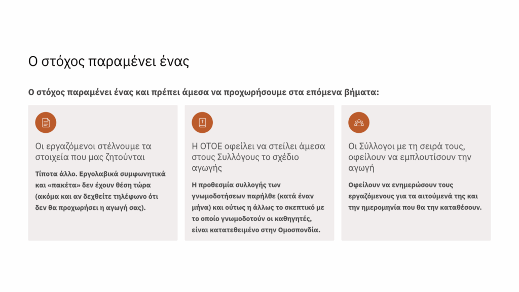 Παραμένουμε ενεργοί με υπευθυνότητα, σοβαρότητα και με συγκεκριμένο σχεδιασμό για την απόλυτη και μεθοδική επίτευξη του στόχου, που αφορά το σύνολο του κλάδου, την μακρόχρονη συνδικαλιστική του ιστορία και τις διαχρονικές κατακτήσεις του.