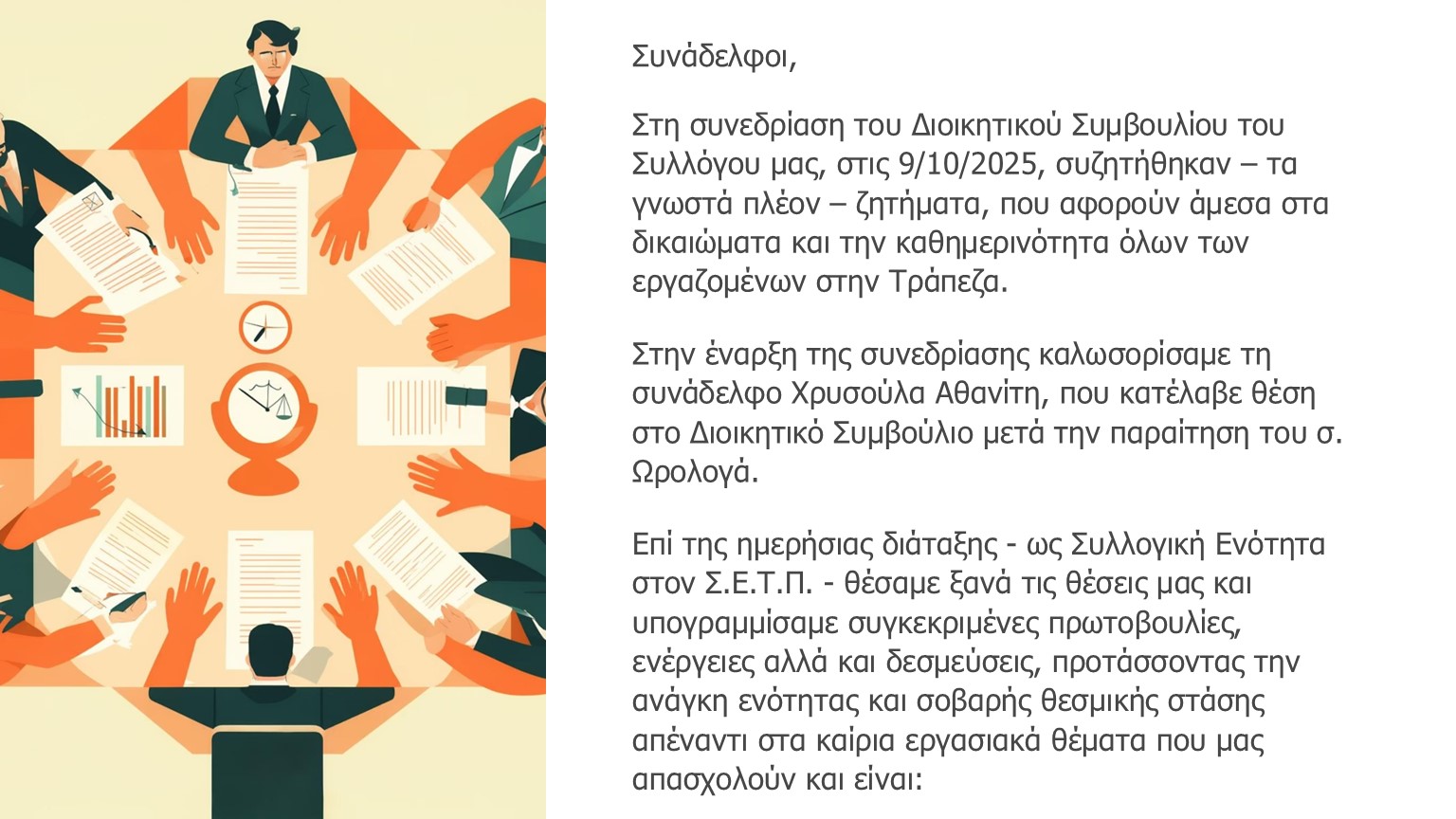 Τέλος έχουμε ζητήσει προς το Προεδρείο του ΣΕΤΠ, τη σύγκλιση έκτακτου Δ.Σ. την ερχόμενη Δευτέρα 3/11/2025 μετά και τα τελευταία γεγονότα.