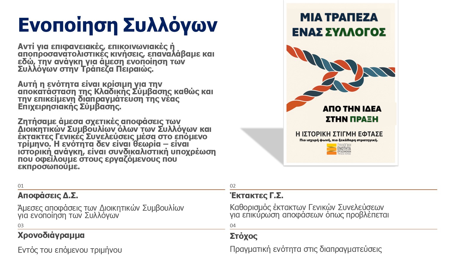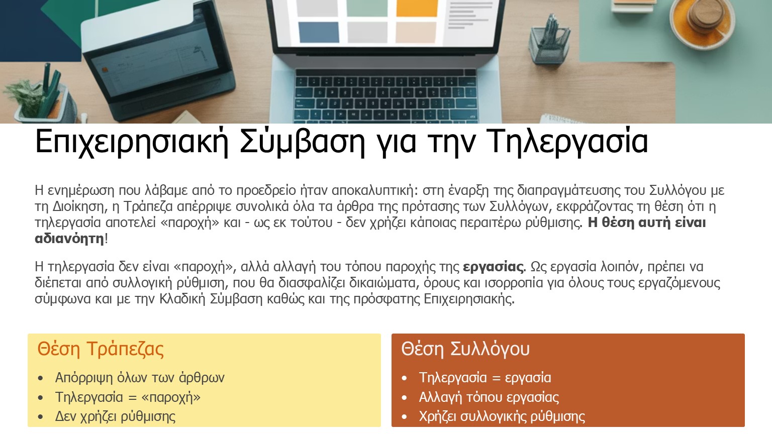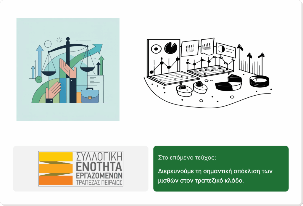 - Αξιοπρεπείς μισθούς με ολιστική ρύθμιση των αποδοχών στην επερχόμενη Επιχειρησιακή Σύμβαση στην Τράπεζα. Ανθρωποκεντρική ρύθμιση των όρων τηλεργασίας σύμφωνα με την πρόταση διαπραγμάτευσης που κατατέθηκε προς τη Διοίκηση.
