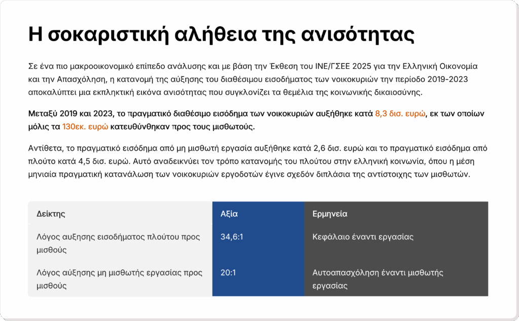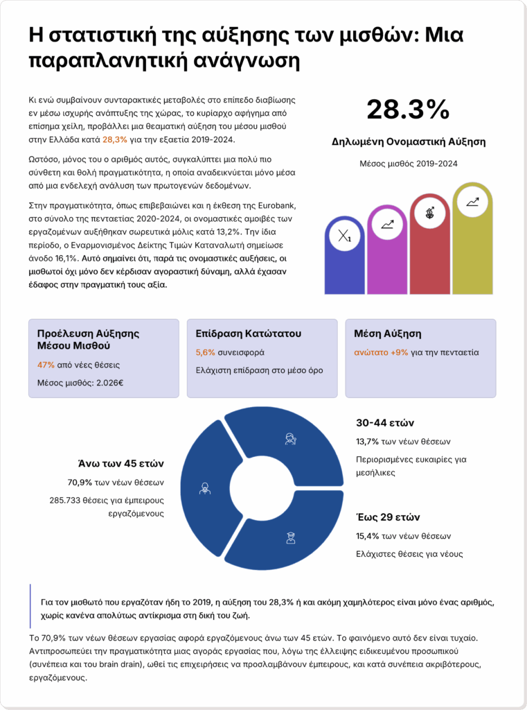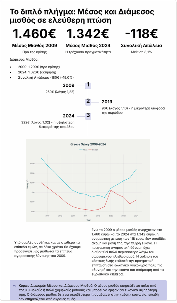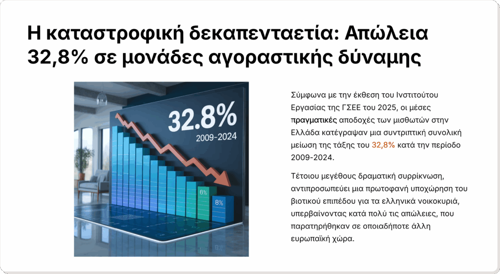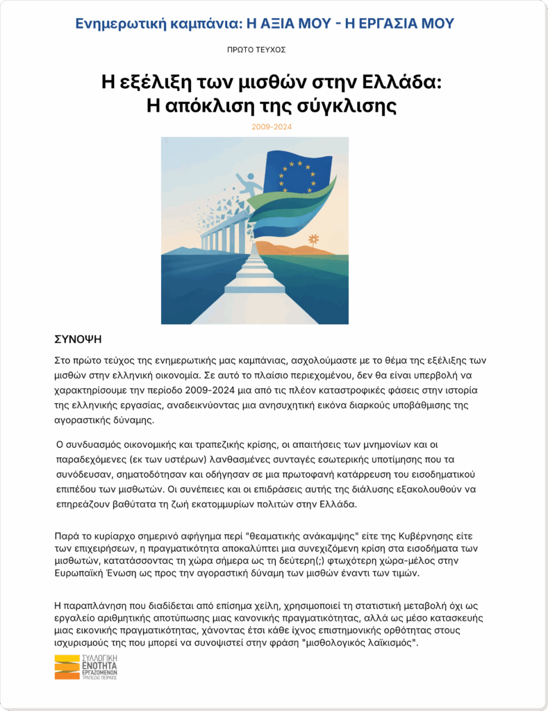 Η Ελλάδα επιπλέον, διαχρονικά καταγράφει ήδη τις περισσότερες ώρες εργασίας στην Ευρώπη σύμφωνα με τον ΟΟΣΑ και ταυτόχρονα χαμηλή αγοραστική δύναμη, με τους μισθούς να παραμένουν πίσω ακόμη και από τα επίπεδα του 2008 με διαμορφωμένες τιμές προϊόντων και υπηρεσιών από το σωρευμένο πληθωρισμό μεταξύ 2019-2025.