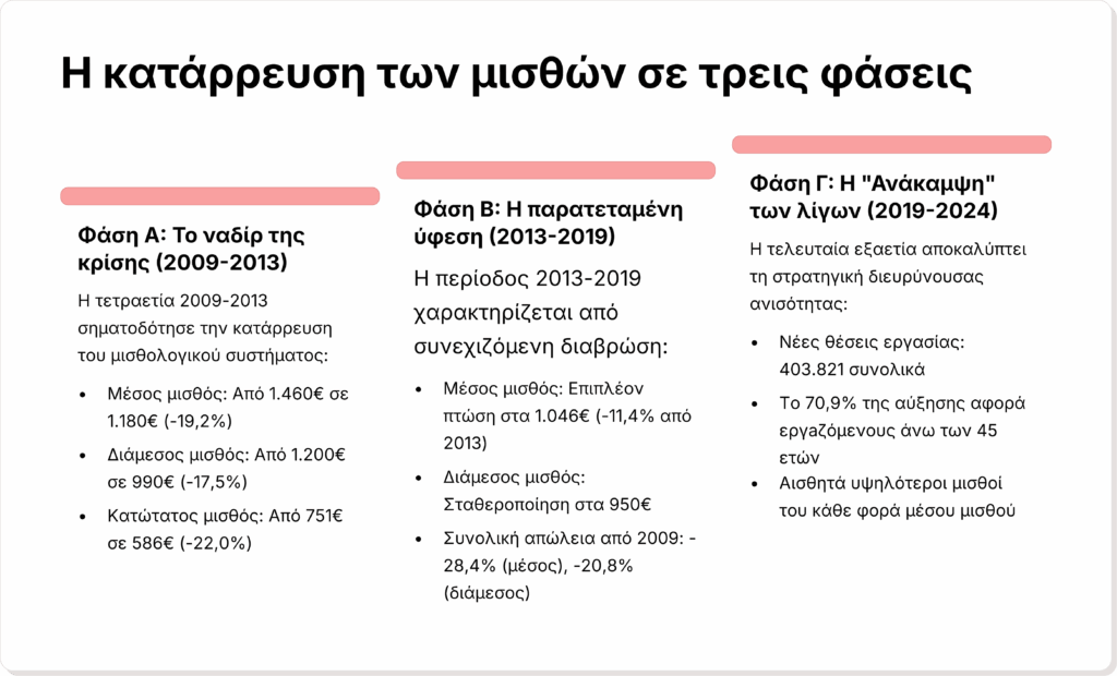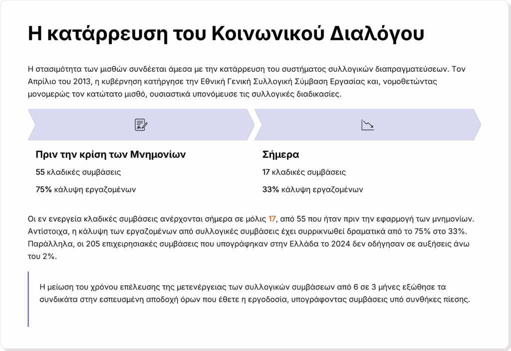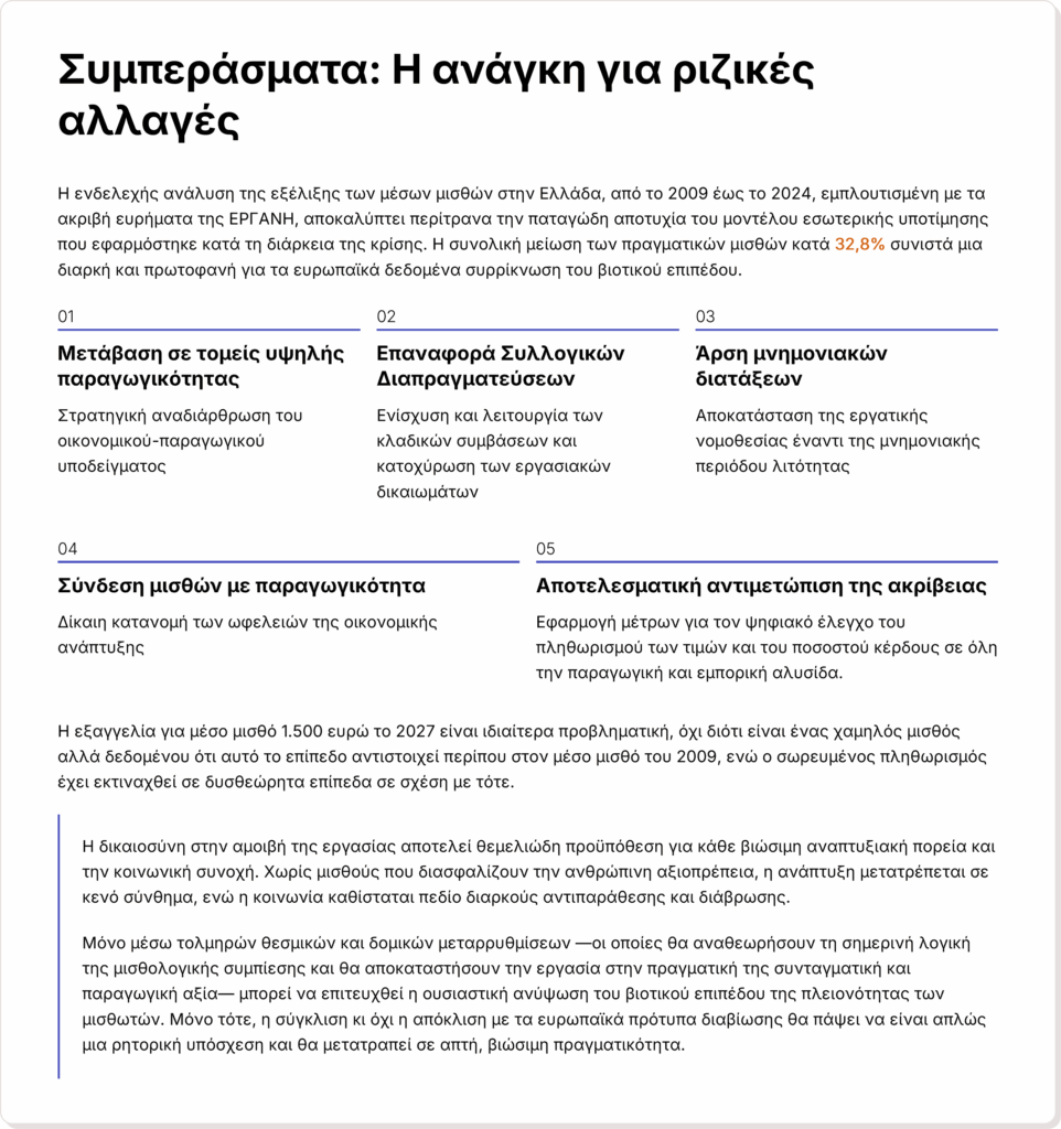 Η Ελλάδα επιλέγει να ανταγωνίζεται με βάση το χαμηλό κόστος εργασίας, στρατηγική που την καταδικάζει σε έναν φαύλο κύκλο υποανάπτυξης όπου η «ανταγωνιστικότητα» επιτυγχάνεται μέσω της υποβάθμισης των εργασιακών συνθηκών και όχι μέσω της αύξησης της παραγωγικότητας.