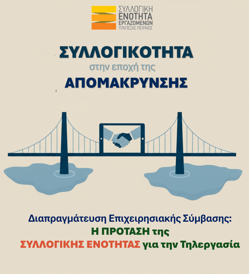 Προσκαλούμε τη Διοίκηση να συνέλθει σε καλόπιστο διάλογο και να συνεργαστεί σε ισότιμη βάση, ώστε να συμφωνηθεί και να υπογραφεί ένα σύγχρονο, λειτουργικό και δίκαιο πλαίσιο ρύθμισης της τηλεργασίας στην Τράπεζα Πειραιώς.