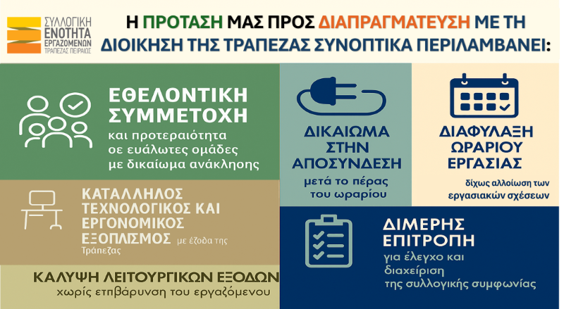 Η Συλλογική Ενότητα έχει καταθέσει ολοκληρωμένο πλαίσιο από τον περασμένο Φεβρουάριο προς το Διοικητικό Συμβούλιο του Σ.Ε.Τ.Π το οποίο και έγινε ομόφωνα αποδεκτό προς αποστολή για διαπραγμάτευση με τη Διοίκηση της Τράπεζας Πειραιώς, δομημένο σε έξι αδιαπραγμάτευτους άξονες: