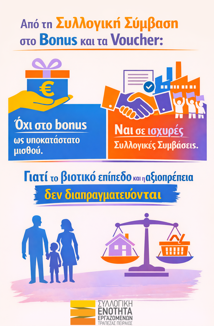 Όχι στο bonus ως υποκατάστατο μισθού. Ναι σε ισχυρές Συλλογικές Συμβάσεις. Γιατί το βιοτικό επίπεδο και η αξιοπρέπεια δεν διαπραγματεύονται.